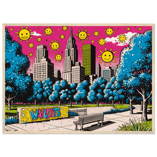 Pink Skies Over Park – Arte Pop Urbano de Central Park con Toques de Graffiti y Cielo Fucsia