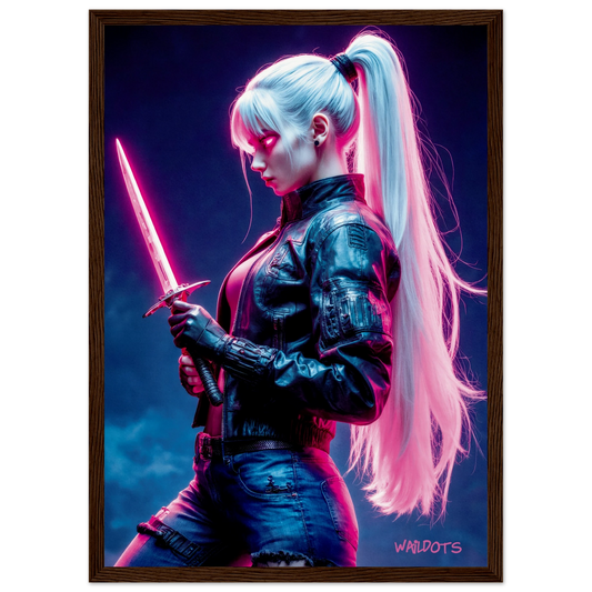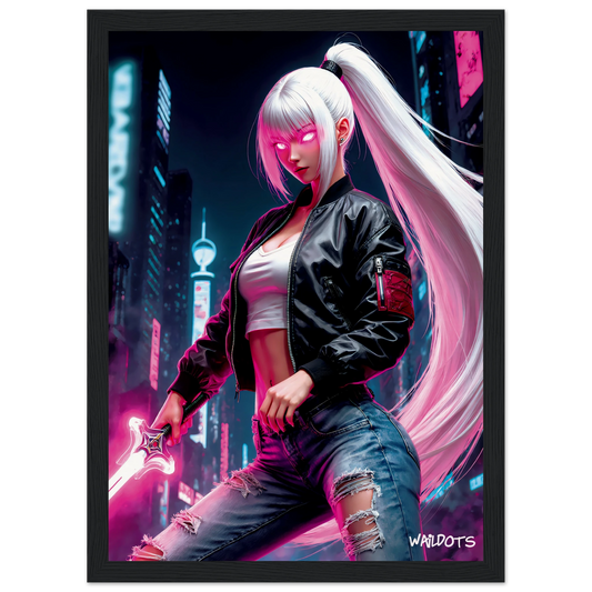 Zyrah – Poster Arte cyberpunk futurista con guerrera de cabello blanco y katana de neón