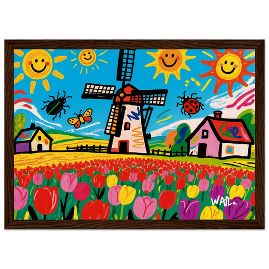 Colorful Tulip Field Landscape & Windmills - Elegant Art Print | Póster de Campo de Tulipanes Coloridos y Molino Holandés