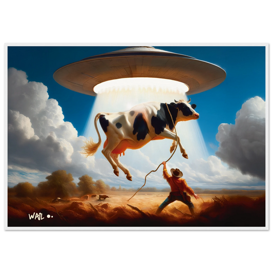 Waildots Ranch | Poster Cowboy surrealista. Vaca abducida por OVNI (UFO)