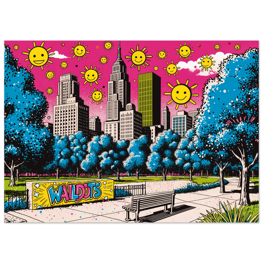 Pink Skies Over Park – Arte Pop Urbano de Central Park con Toques de Graffiti y Cielo Fucsia
