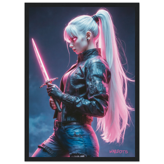 Zyrah – Poster Arte cyberpunk futurista con guerrera de cabello blanco y katana de neón