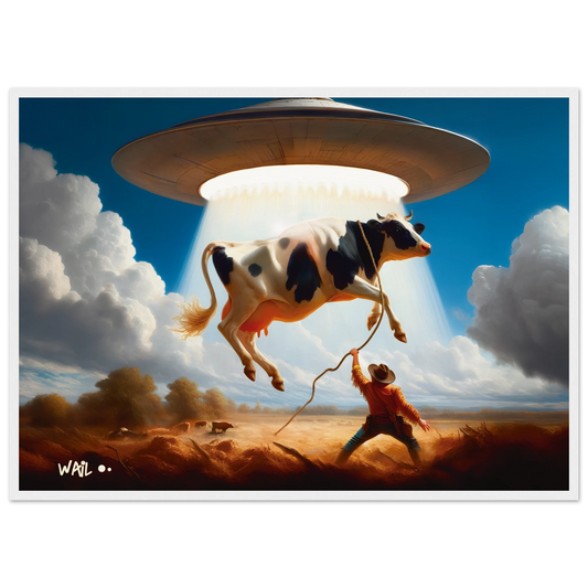 Waildots Ranch | Poster Cowboy surrealista. Vaca abducida por OVNI (UFO)