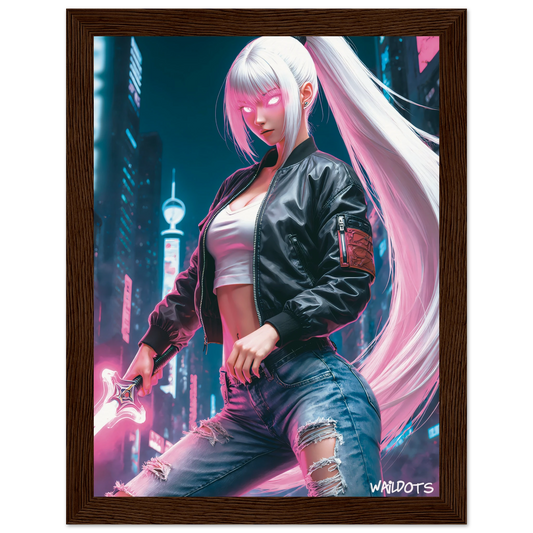 Zyrah Cyberpunk Art Print | Futuristic White-Haired Warrior with Neon Katana