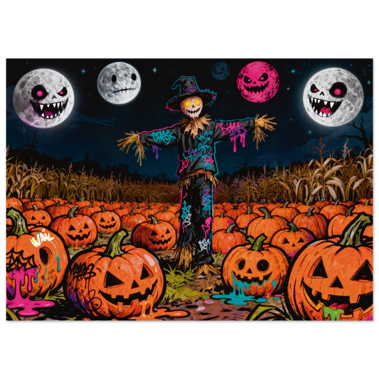 Pumpkin Neon Harvest – Espantapájaros del Terror | Arte Pop de Halloween con Calabazas y Graffiti