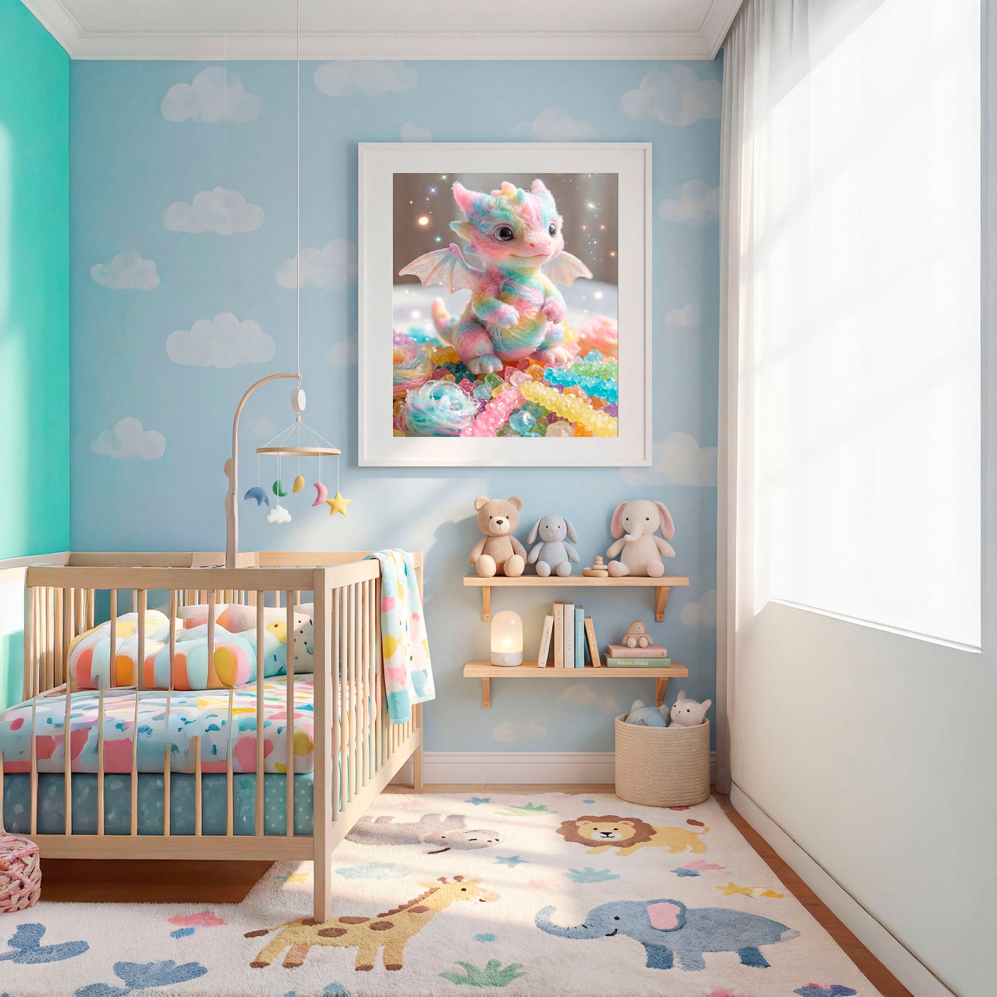 Adorable dragón de colores pastel, con textura suave tipo algodón de azúcar, aparece rodeado de cristales de caramelo en tonos vibrantes. Su aspecto dulce y mágico, junto con las pequeñas alas brillantes y el fondo luminoso lleno de destellos, crean una escena fantástica perfecta para decoración infantil con ilustraciones de fantasía. Una pieza ideal para quienes buscan arte tierno, colorido y con un toque mágico que ilumine cualquier espacio.