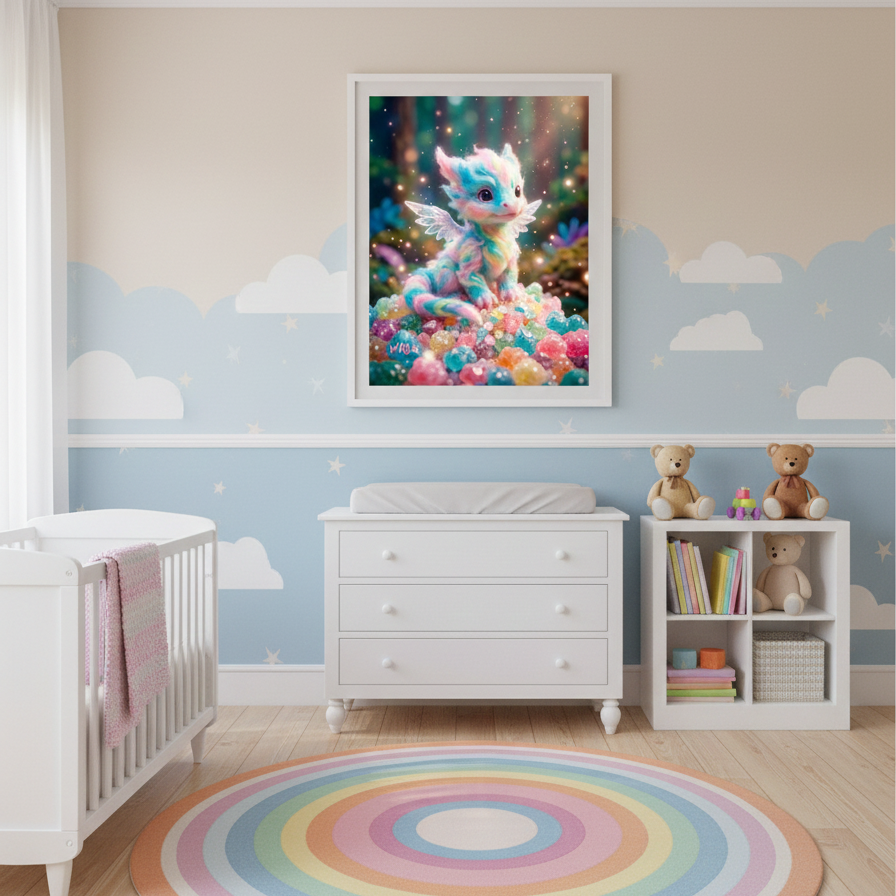 Adorable dragón de colores pastel, con textura suave tipo algodón de azúcar, aparece rodeado de cristales de caramelo en tonos vibrantes. Su aspecto dulce y mágico, junto con las pequeñas alas brillantes y el fondo luminoso lleno de destellos, crean una escena fantástica perfecta para decoración infantil con ilustraciones de fantasía. Una pieza ideal para quienes buscan arte tierno, colorido y con un toque mágico que ilumine cualquier espacio.
