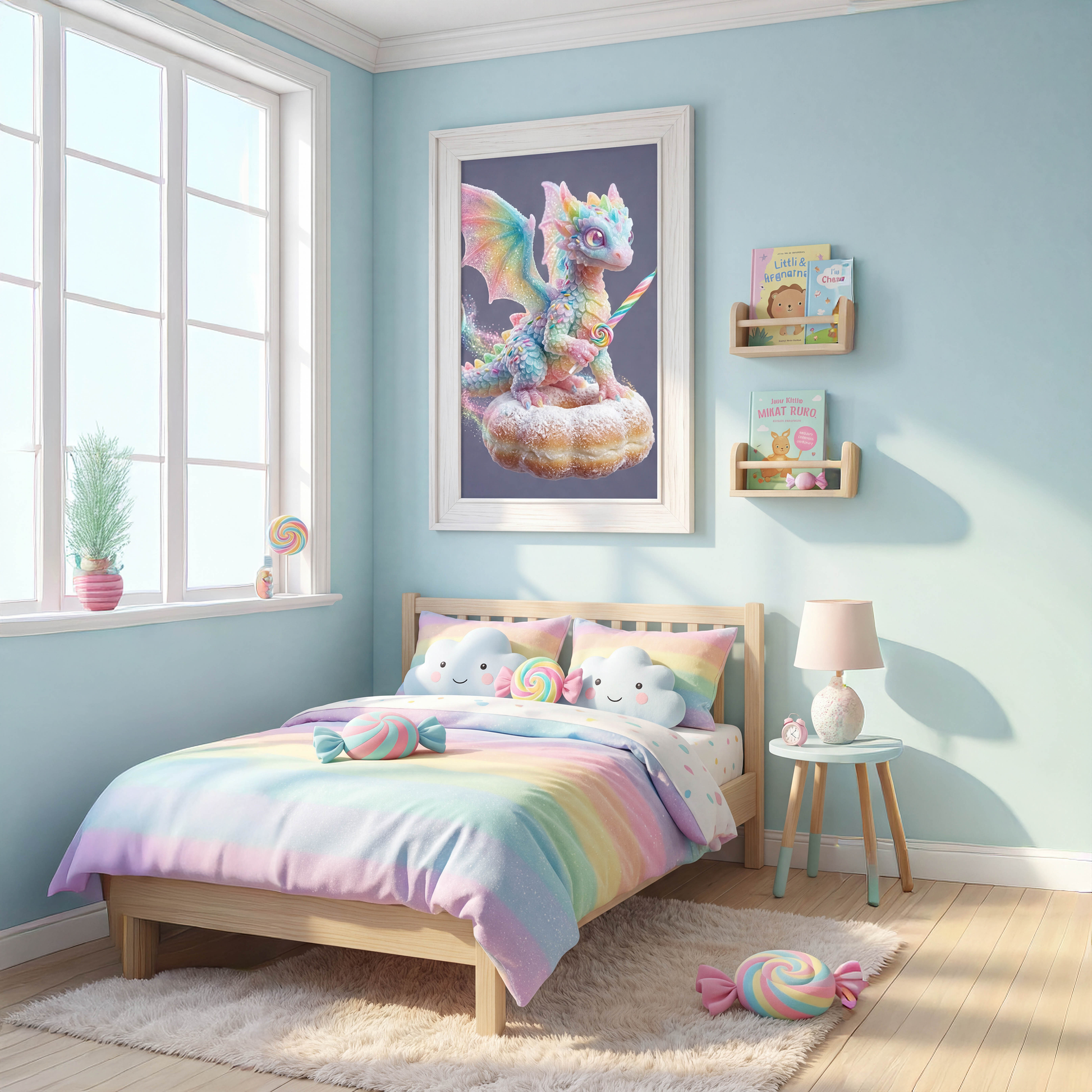 Adorable dragón de colores pastel, con textura tipo chuchería de azúcar, aparece volando en un donut en tonos vibrantes. Su aspecto dulce y mágico, junto con las pequeñas alas brillantes y el fondo monocromático, crean una escena fantástica perfecta para decoración infantil con ilustraciones de fantasía. Una pieza ideal para quienes buscan arte tierno, colorido y con un toque mágico que ilumine cualquier espacio.