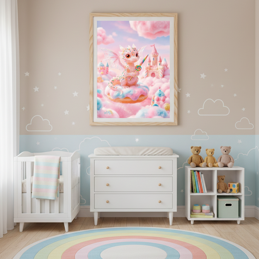 Adorable dragón de colores pastel, con textura suave tipo algodón de azúcar, aparece volando sobre un donut en tonos vibrantes. Su aspecto dulce y mágico, junto con las pequeñas alas brillantes y el fondo luminoso lleno de destellos, crean una escena fantástica perfecta para decoración infantil con ilustraciones de fantasía. Una pieza ideal para quienes buscan arte tierno, colorido y con un toque mágico que ilumine cualquier espacio.